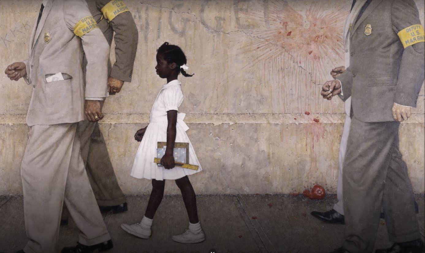 Piano piano la gente mandò i figli a scuola e la classe si riempì, le proteste cominciarono a calmarsi e la famiglia tornò alla vita tranquilla. Perché ho raccontato questo episodio? Perché l’arte prende ispirazione anche da questi eventi, l’arte denuncia, comunica, colpisce a volte come un pugno allo stomaco. In questo caso un artista americano Norman Rockwell dipinse il quadro “The problem we all live with” (Il problema con cui tutti conviviamo), che scatenò polemiche ovviamente per i contenuti e il tema, ma che è simbolico di un’America che sta cambiando.