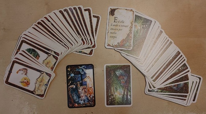 Mi son ricordata del mio passato da giocatrice di ruolo e mi è tornato alla mente un gioco che mi avevano regalato amici di vecchia data, comprato a Lucca, che si chiama “One upon a time”, ossia “c’era una volta”. Nome del gioco inglese ma carte in italiano, per intenderci. Insomma mi fu regalato anni fa e l’ho rispolverato ricordando le risate con 5 carte, ogni giocatore con un finale diverso e la fatica di far girare la storia per arrivare al proprio finale.