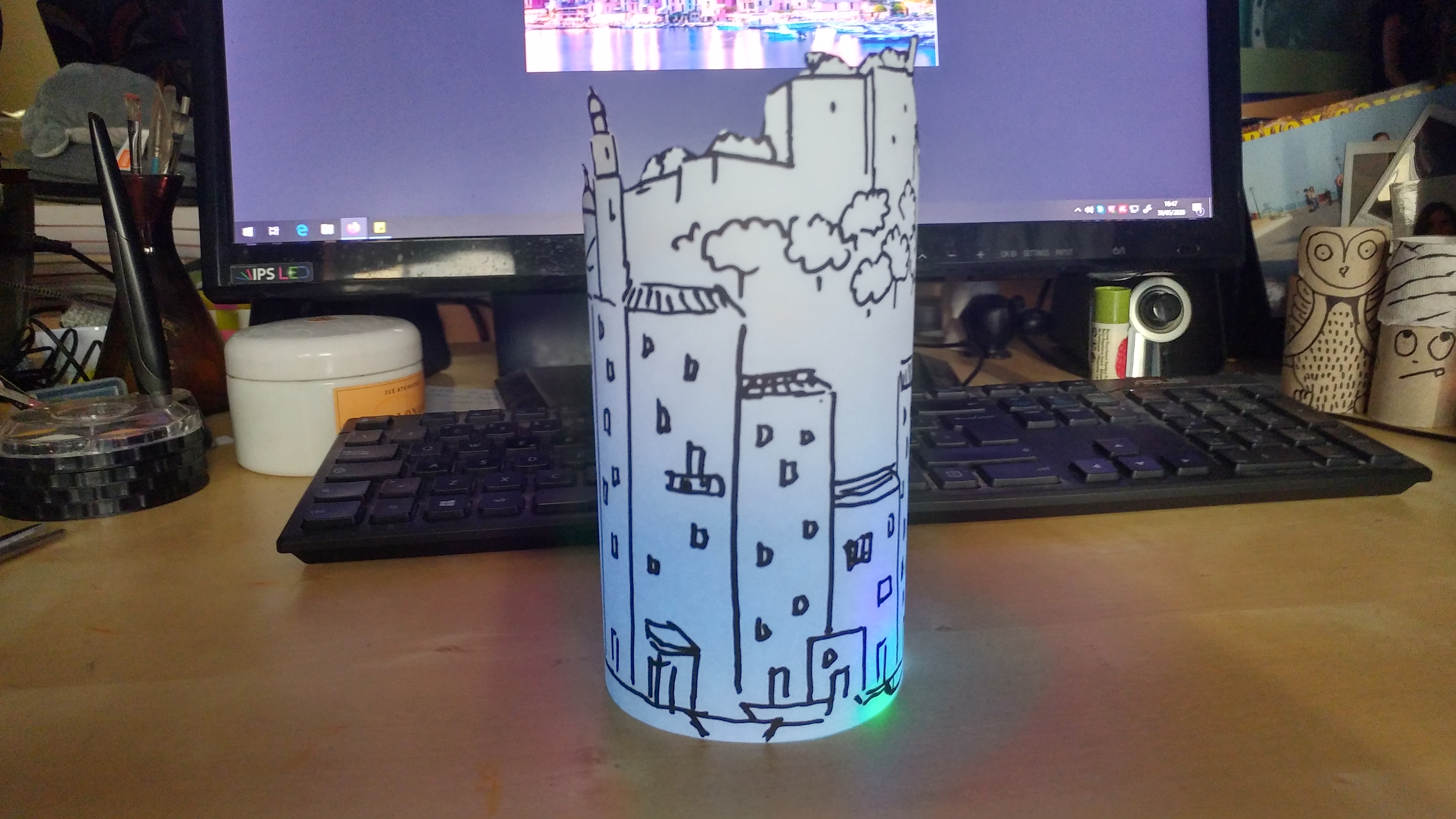 5. Ho messo il led acceso nel barattolo e poi ho messo il paesaggio a circondare il barattolo. Spegnete le luci e…..MAGIA….